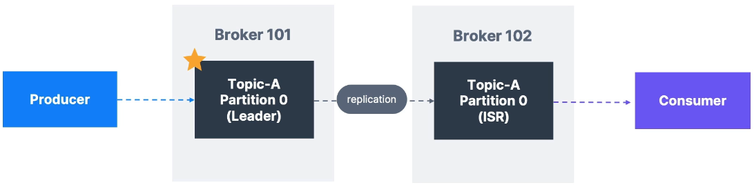 - 만약 현재 리더 브로커가 다운된다면 레플리카가 리더 브로커가 돼서 프로듀서와 컨슈머에게 데이터 제공