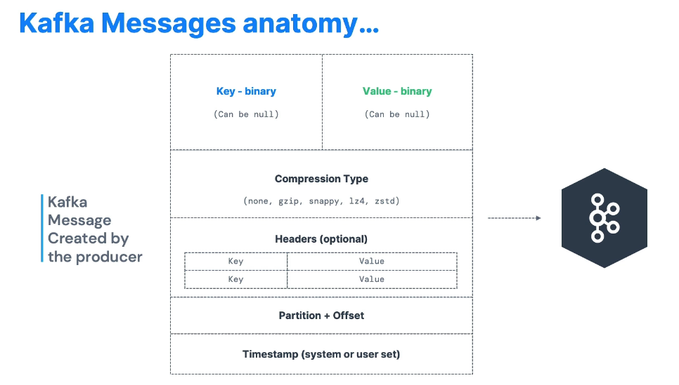 - 키(메시지 키),밸류(메시지), 압축타입, 헤더(선택사항,키밸류), 어디에 전송할지 포지션+오프셋, 타임스탬프로 구성됨