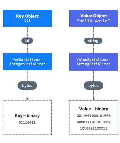 - ⇒ 카프카 프로듀서가 값 객체 “hello world”를 Binary 00110010001010000000111010011……… 이런식으로 변환