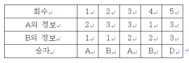 가위, 바위, 보의 정보는 1:가위, 2:바위, 3:보로 정하겠습니다.